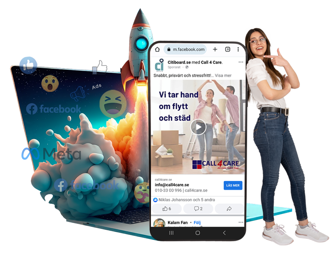 Sociala medier är idag en av de mest effektiva kanalerna för att nå nya kunder. Genom vårt samarbete med systerbolaget Citiboard Media AB, som ingår i samma koncern, erbjuder vi en komplett lösning för företag som vill annonsera på Facebook och Instagram — utan att behöva hantera teknik, strategi eller annonsering själva.